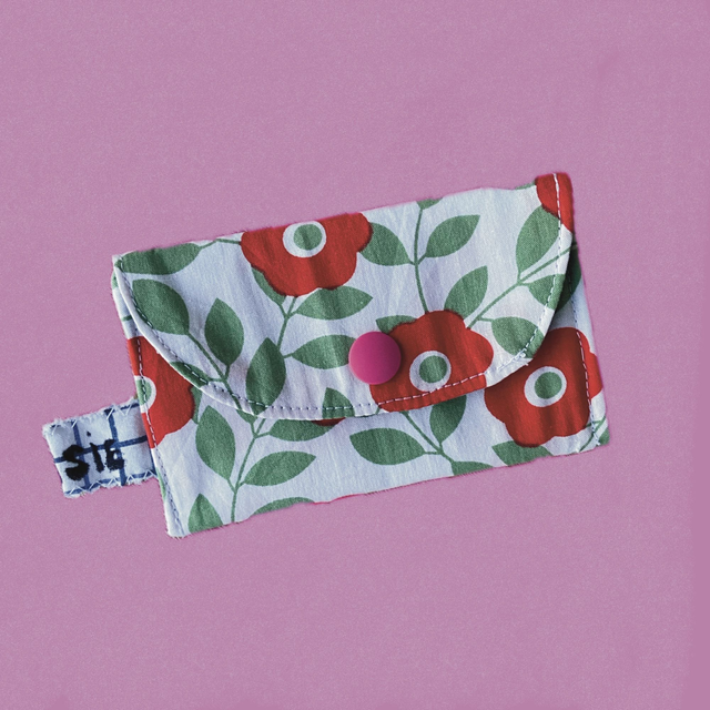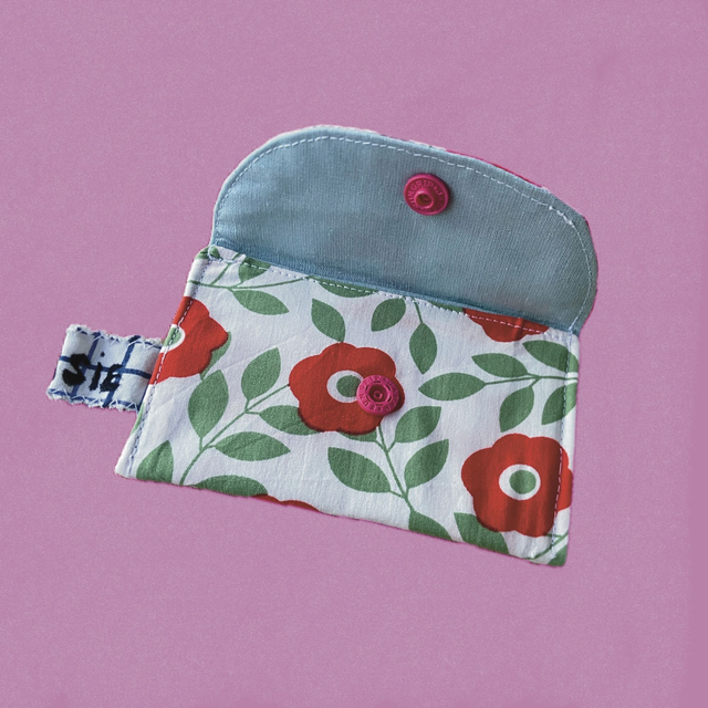 Création à partir de chutes de tissus, ajout d'un thermocollant pour renforcer l'accessoire et d'un bouton pression pour fermer le porte-carte.
